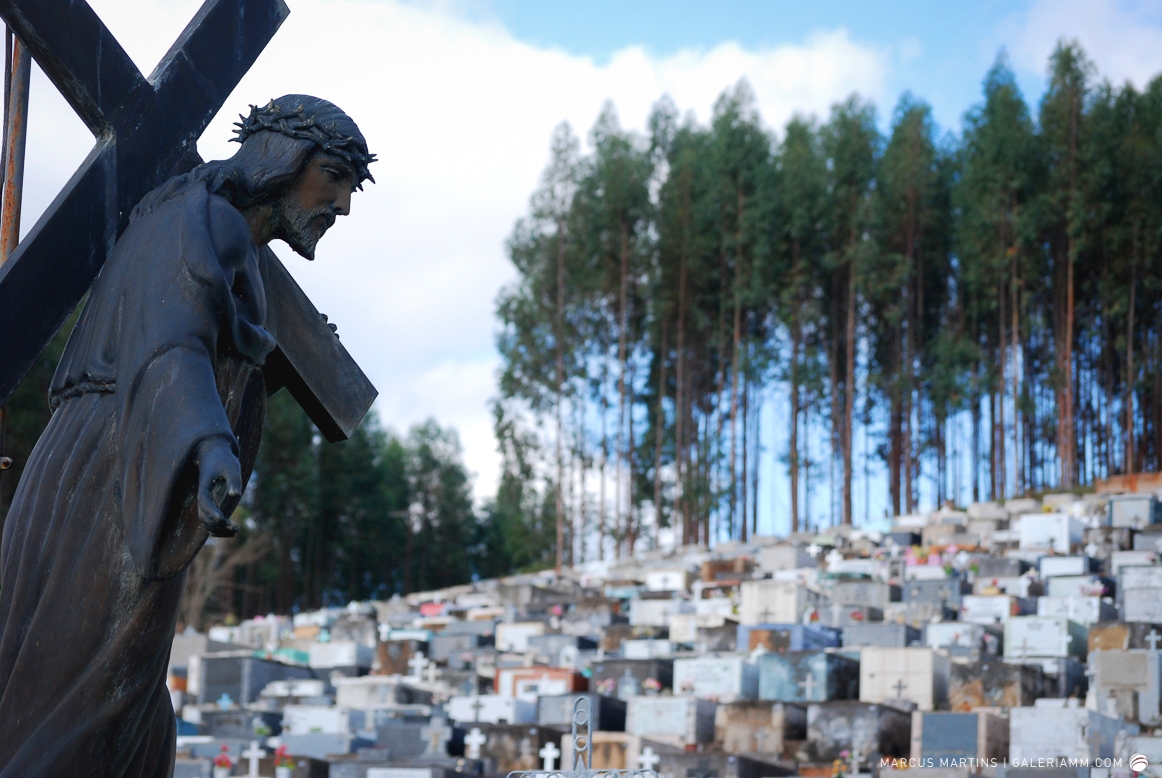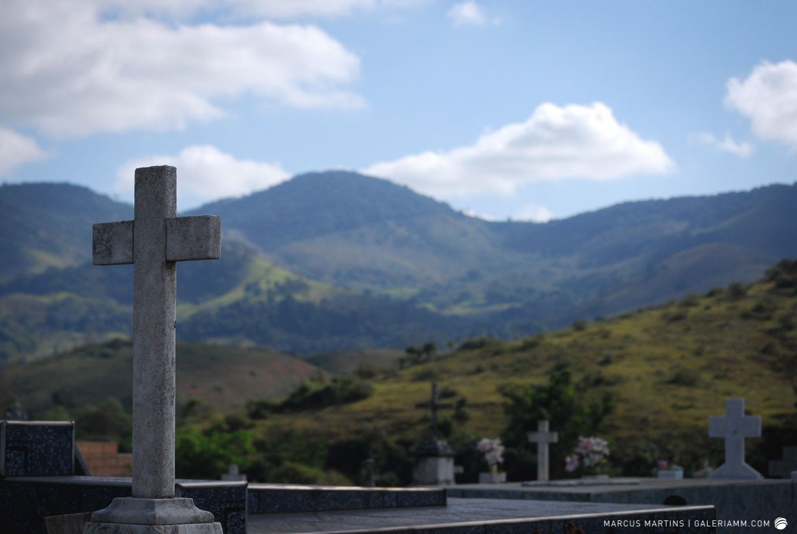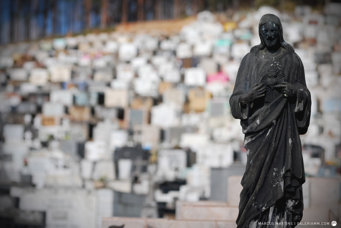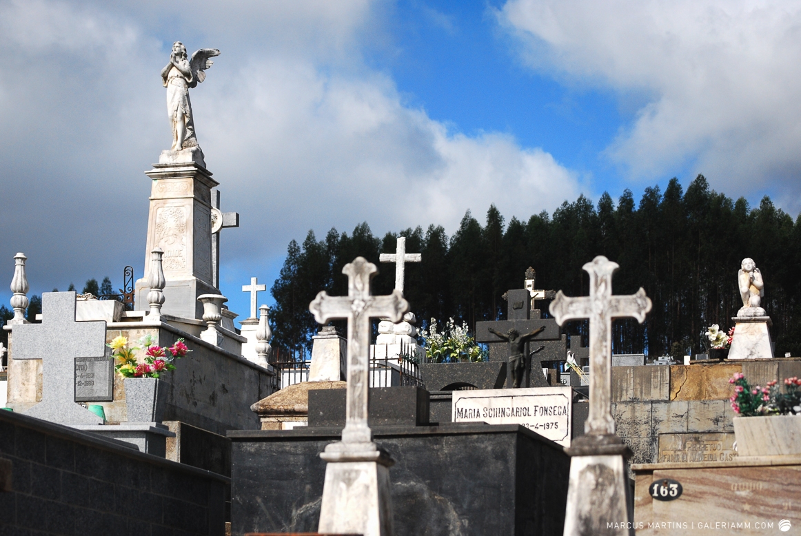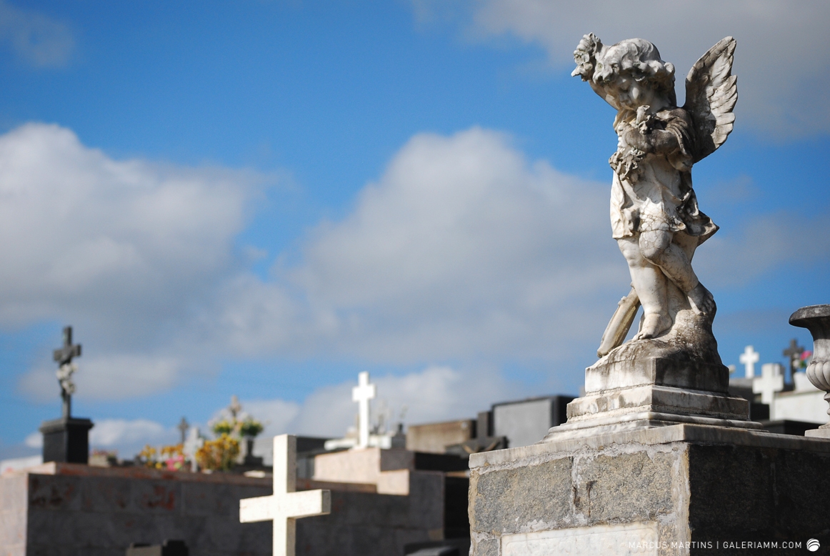 Pode parecer estranho, mas caminhar pelo cemitério em busca de detalhes de arte tumular e histórias de mortos é uma experiência gratificante. Ao passar em frente ao local, me chamou a atenção a escultura de um anjo. E, como o portão estava aberto, entrei. Fiquei observando um pouco o local antes de começar a fotografar. Vi um cachorro descansando em cima de um túmulo e esse foi o primeiro tema a ser capturado. Daí, a andança continuou entre leituras de lápides e fotos de jazigos e esculturas. Nos túmulos das primeiras fileiras, muitos dos que contribuíram para o desenvolvimento de São João Nepomuceno e, hoje, emprestam seus nomes às ruas e espaços públicos da cidade. Uma ótima aula sobre a história local. E quanto maior fora a importância e presença econômica e política da pessoa, melhor o acabamento e a localização da sepultura. No alto do morro, o espaço reservado para os menos abastados, com túmulos menos rebuscados e mais geométricos.
