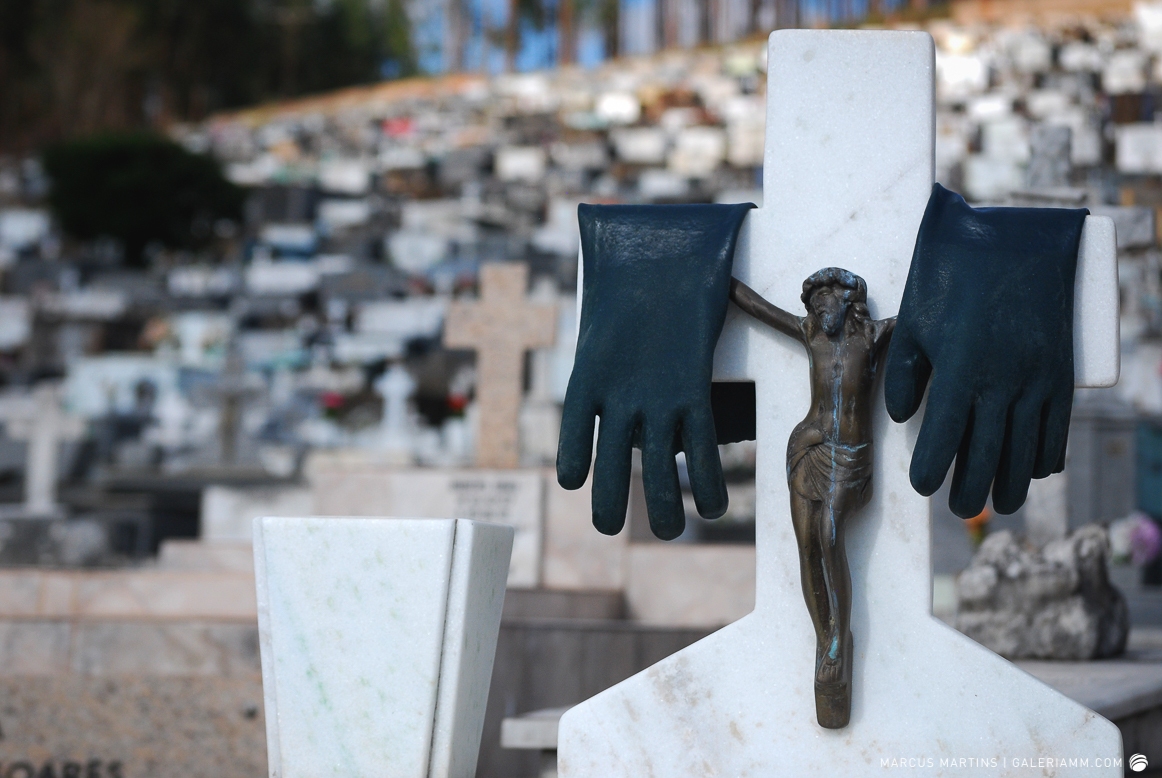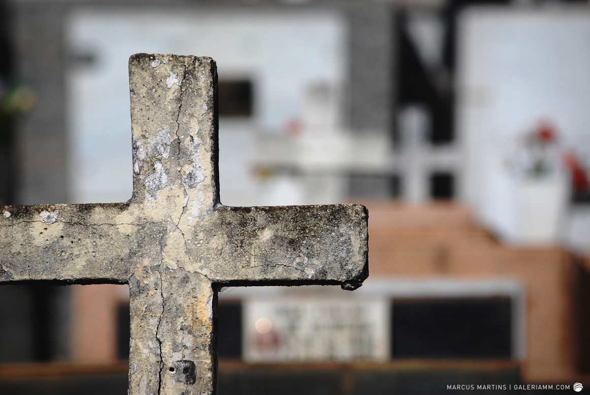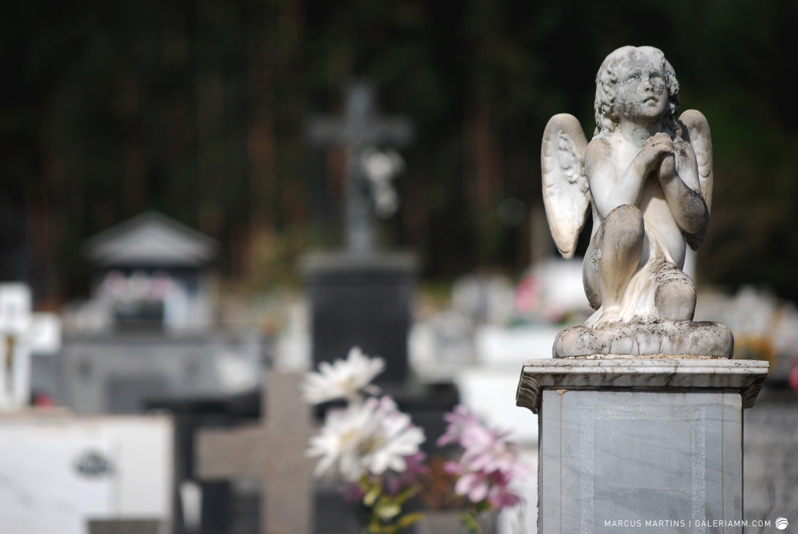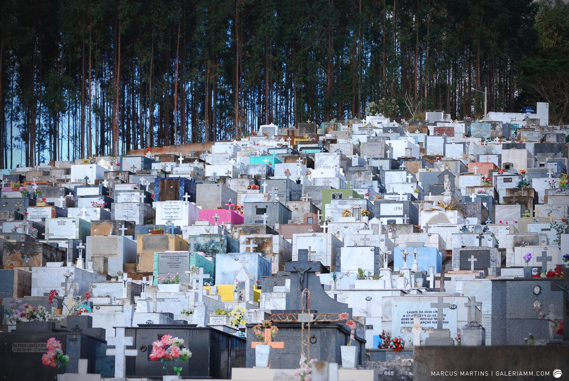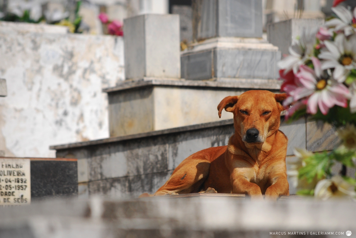 Pode parecer estranho, mas caminhar pelo cemitério em busca de detalhes de arte tumular e histórias de mortos é uma experiência gratificante. Ao passar em frente ao local, me chamou a atenção a escultura de um anjo. E, como o portão estava aberto, entrei. Fiquei observando um pouco o local antes de começar a fotografar. Vi um cachorro descansando em cima de um túmulo e esse foi o primeiro tema a ser capturado. Daí, a andança continuou entre leituras de lápides e fotos de jazigos e esculturas. Nos túmulos das primeiras fileiras, muitos dos que contribuíram para o desenvolvimento de São João Nepomuceno e, hoje, emprestam seus nomes às ruas e espaços públicos da cidade. Uma ótima aula sobre a história local. E quanto maior fora a importância e presença econômica e política da pessoa, melhor o acabamento e a localização da sepultura. No alto do morro, o espaço reservado para os menos abastados, com túmulos menos rebuscados e mais geométricos.