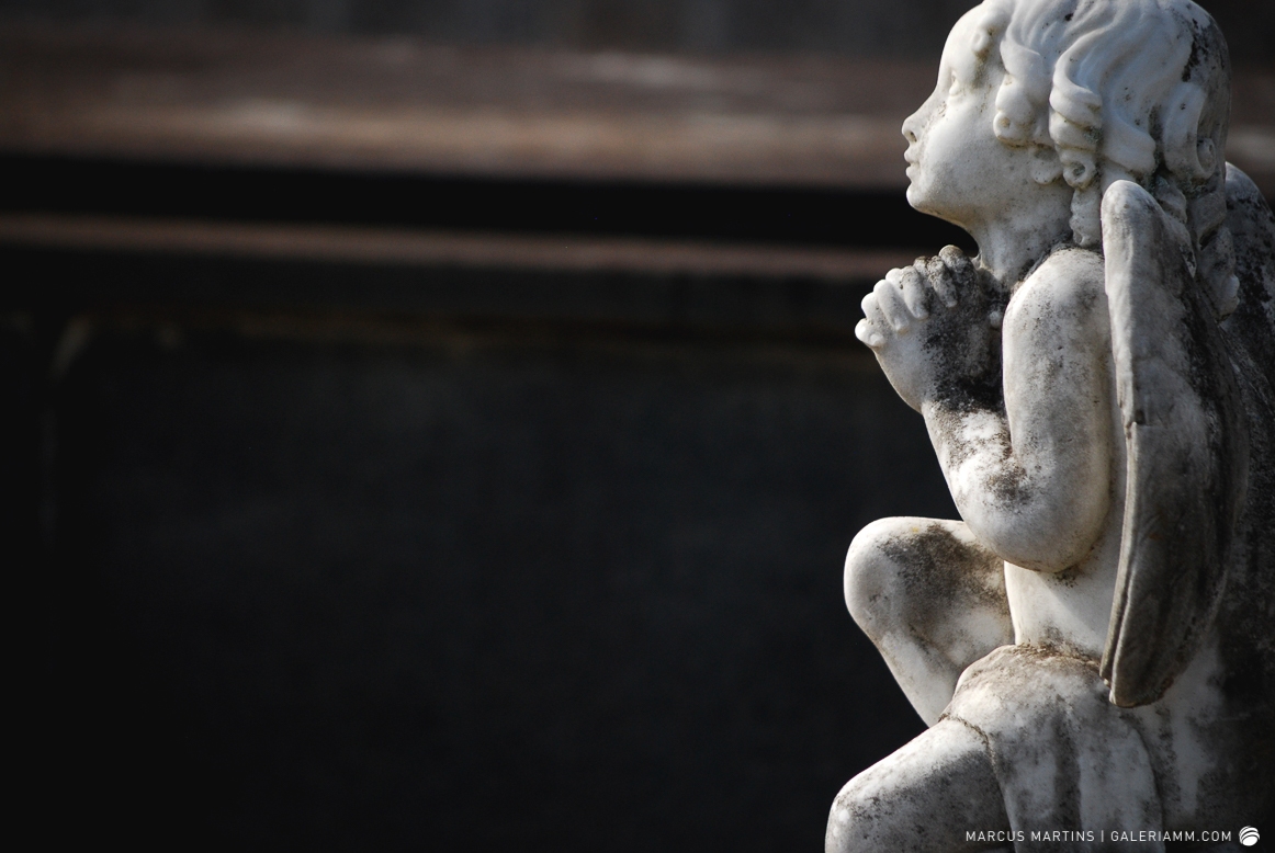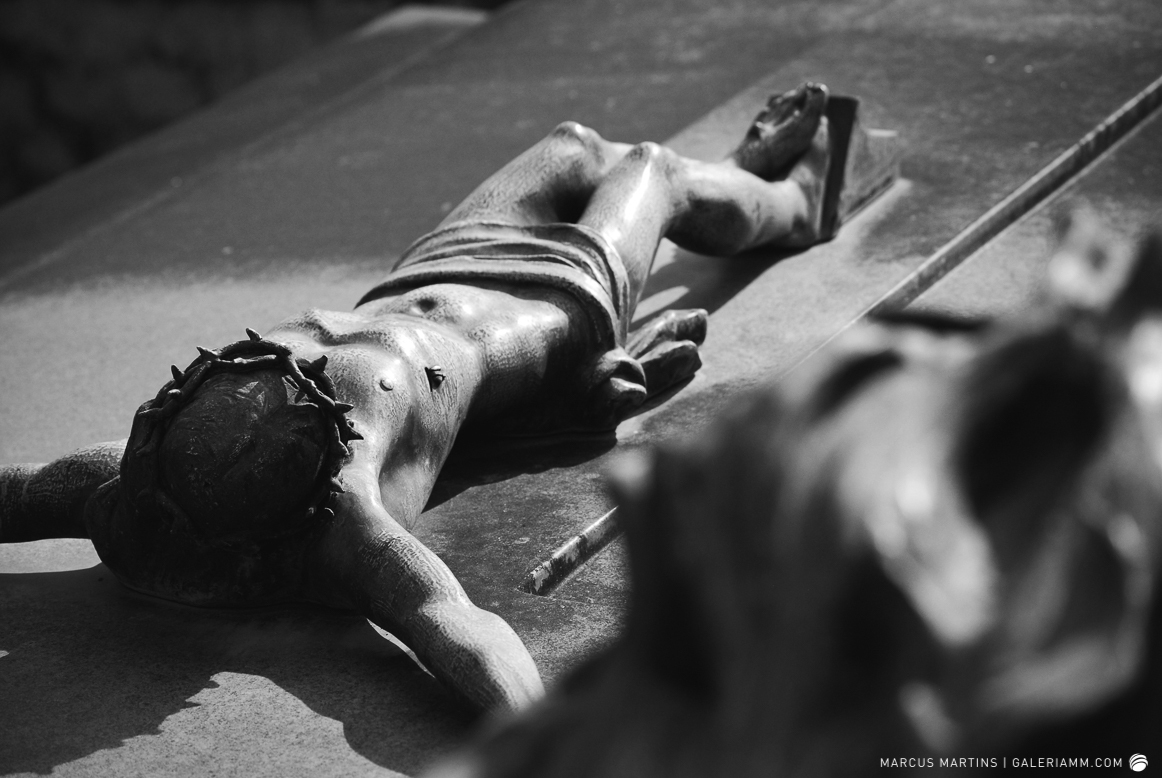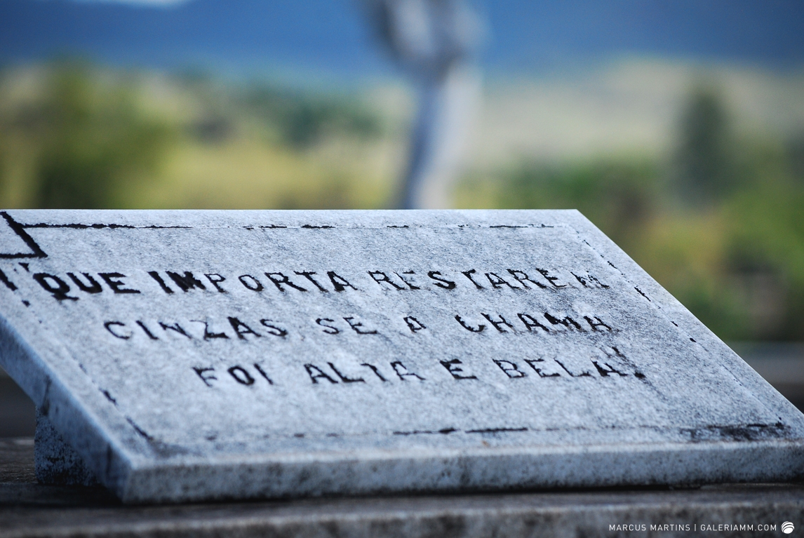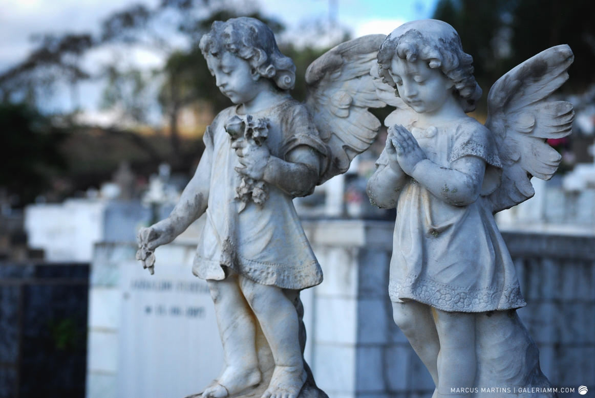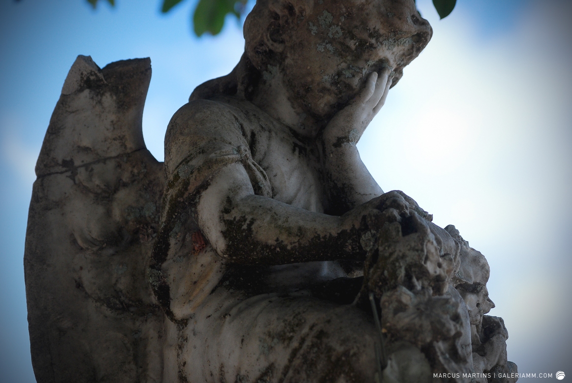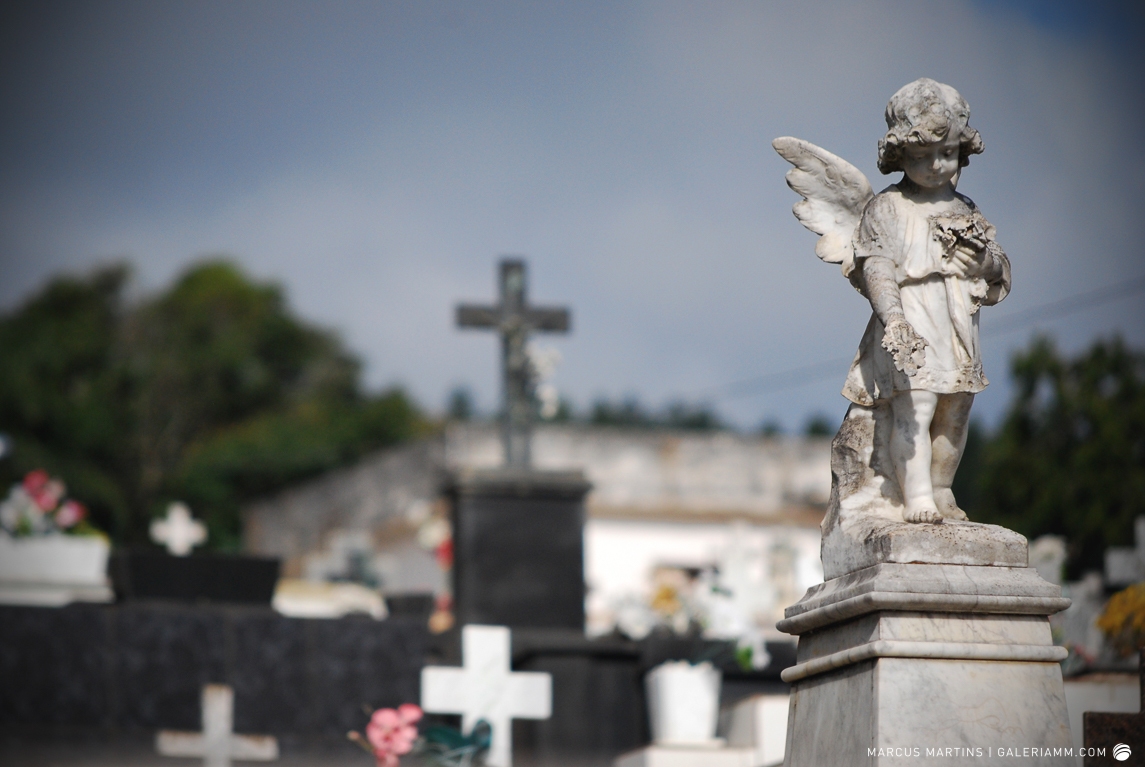 Pode parecer estranho, mas caminhar pelo cemitério em busca de detalhes de arte tumular e histórias de mortos é uma experiência gratificante. Ao passar em frente ao local, me chamou a atenção a escultura de um anjo. E, como o portão estava aberto, entrei. Fiquei observando um pouco o local antes de começar a fotografar. Vi um cachorro descansando em cima de um túmulo e esse foi o primeiro tema a ser capturado. Daí, a andança continuou entre leituras de lápides e fotos de jazigos e esculturas. Nos túmulos das primeiras fileiras, muitos dos que contribuíram para o desenvolvimento de São João Nepomuceno e, hoje, emprestam seus nomes às ruas e espaços públicos da cidade. Uma ótima aula sobre a história local. E quanto maior fora a importância e presença econômica e política da pessoa, melhor o acabamento e a localização da sepultura. No alto do morro, o espaço reservado para os menos abastados, com túmulos menos rebuscados e mais geométricos.