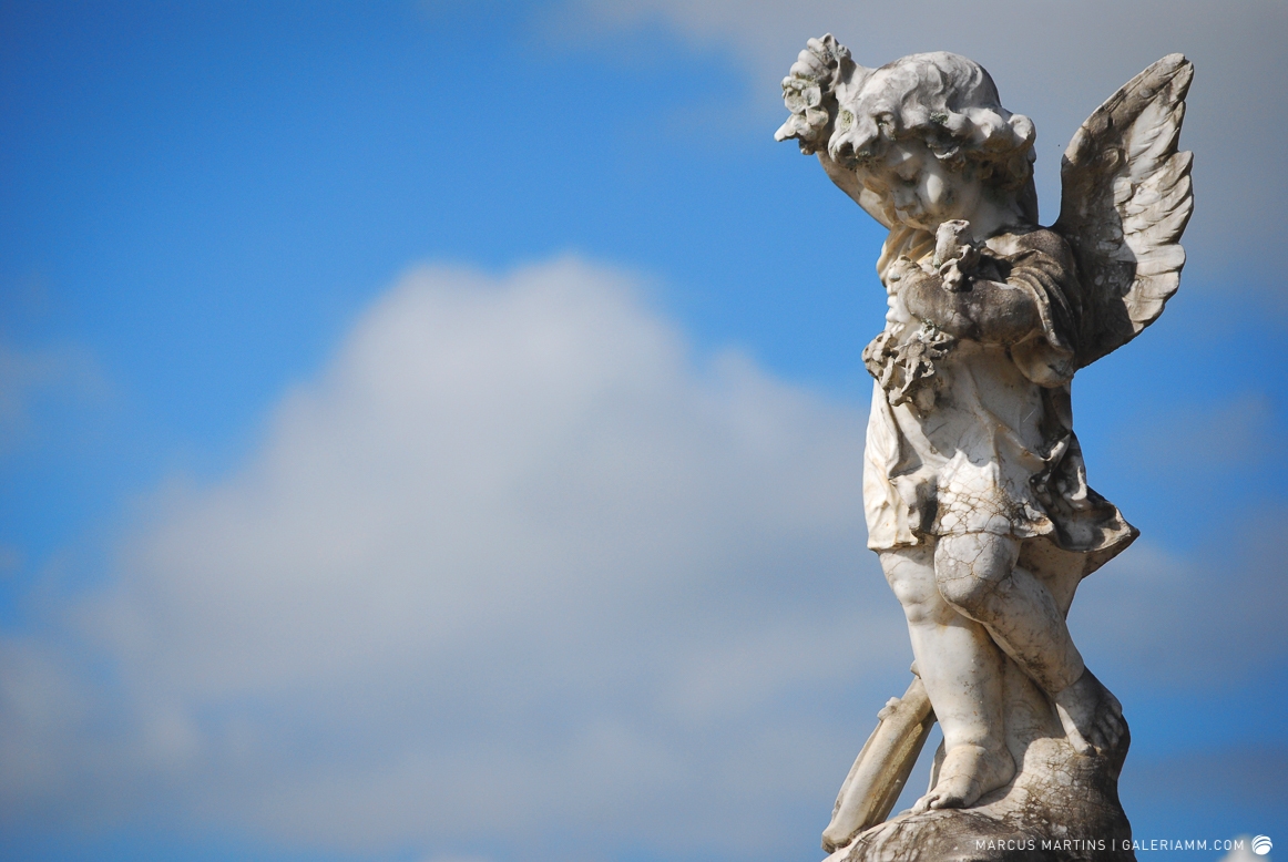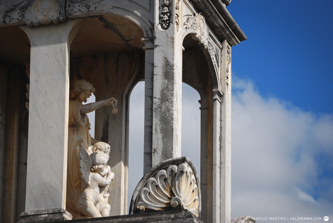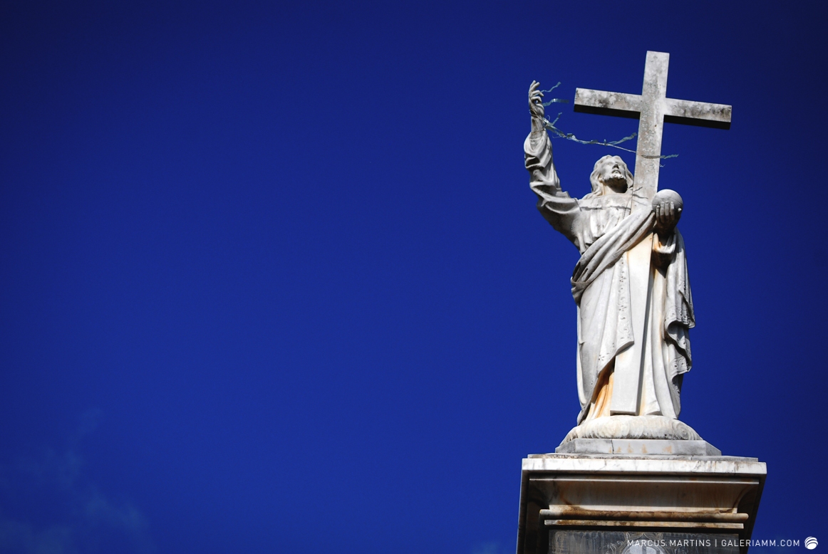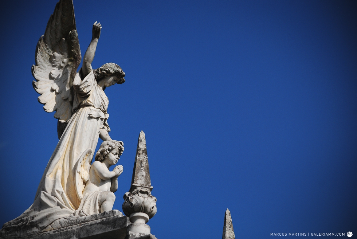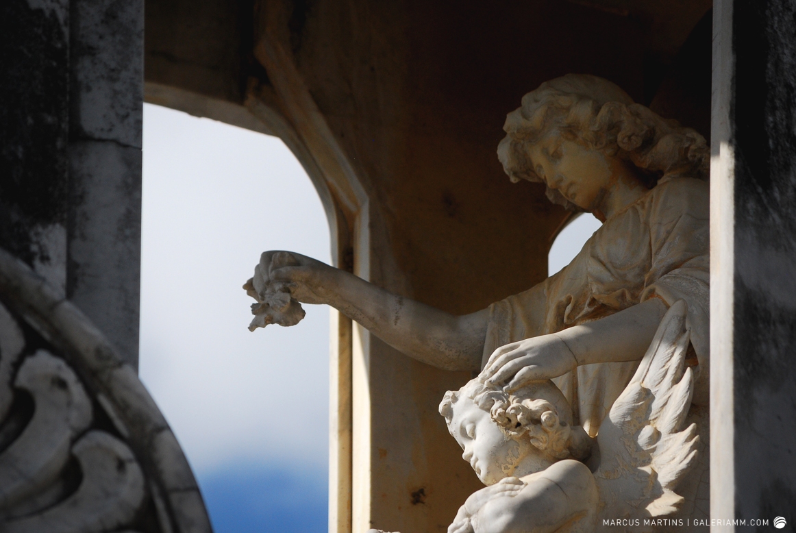 Pode parecer estranho, mas caminhar pelo cemitério em busca de detalhes de arte tumular e histórias de mortos é uma experiência gratificante. Ao passar em frente ao local, me chamou a atenção a escultura de um anjo. E, como o portão estava aberto, entrei. Fiquei observando um pouco o local antes de começar a fotografar. Vi um cachorro descansando em cima de um túmulo e esse foi o primeiro tema a ser capturado. Daí, a andança continuou entre leituras de lápides e fotos de jazigos e esculturas. Nos túmulos das primeiras fileiras, muitos dos que contribuíram para o desenvolvimento de São João Nepomuceno e, hoje, emprestam seus nomes às ruas e espaços públicos da cidade. Uma ótima aula sobre a história local. E quanto maior fora a importância e presença econômica e política da pessoa, melhor o acabamento e a localização da sepultura. No alto do morro, o espaço reservado para os menos abastados, com túmulos menos rebuscados e mais geométricos.